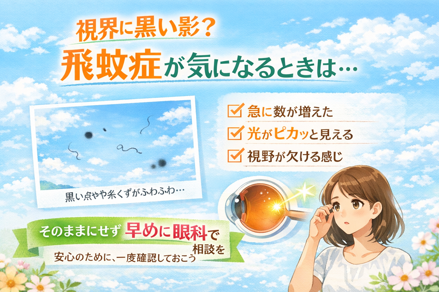 飛蚊症の違和感が続き、業務中の集中力に影響を感じていました。